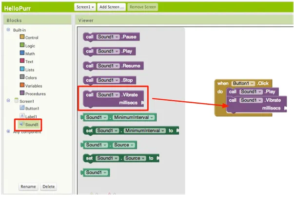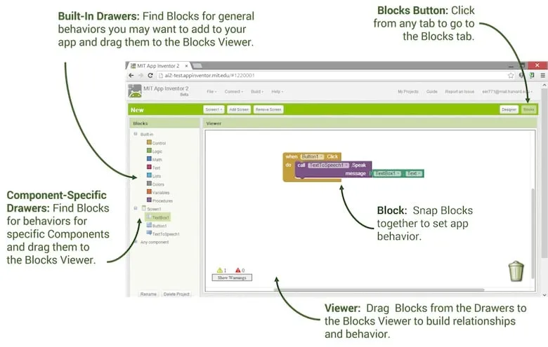 To get into the Blocks view , click on the “Blocks” button. The “Blocks view” basically allows you to code for events of interest for your app. Here are some generic concepts about “Blocks”: