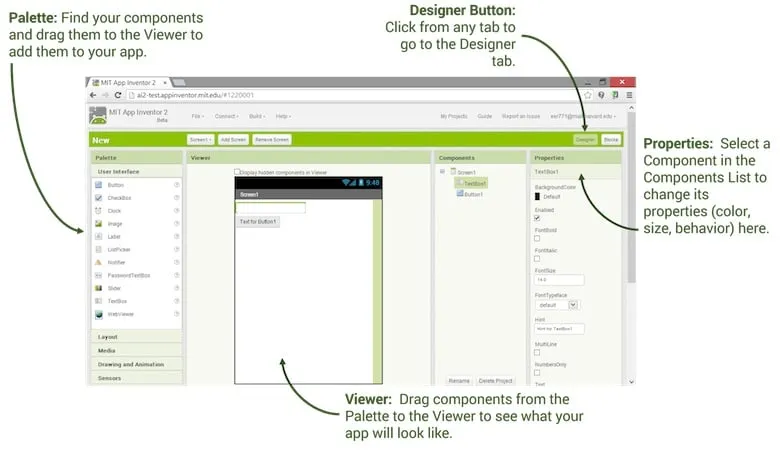 Since the MIT App Inventor is cloud based, you need to first navigate to the AI 2 link in the Web browser. Note: AI 2 does not support Internet Explorer and instead recommends Chrome or Firefox.